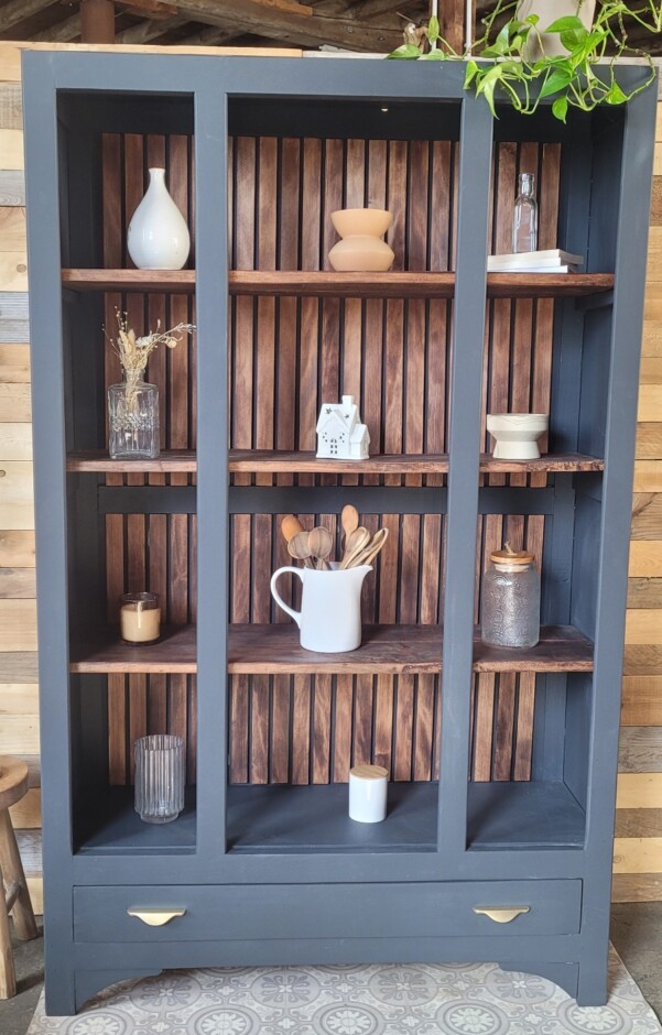 Vitrine entièrement relookée entre la croisée du moderne et de l’authentique. Elle a été nettoyé et décapé, l’ensemble à été peint en gris anthracite mat et habillé de tasseaux teinté couleur bois pour le fond. Les étagères d’origines sont teintées couleur bois. Poigné neuve style métal/dorés Dimensions : Hauteur : 1.85 M Largeur […]